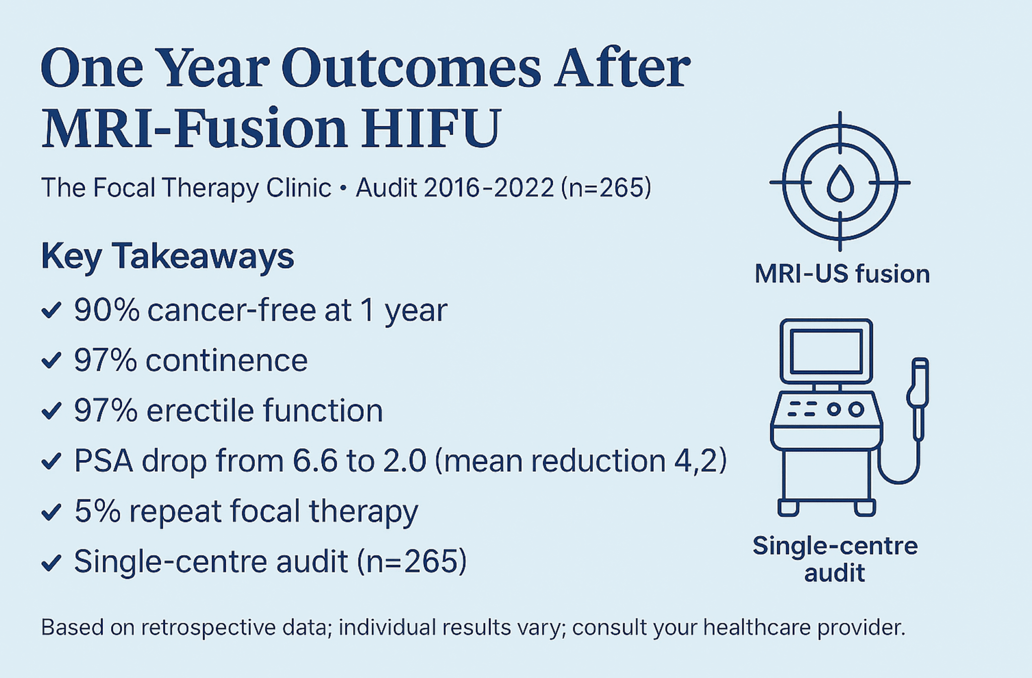 In our clinical audit of 265 consecutive men treated with MRI-fusion HIFU (High-Intensity Focused Ultrasound, NICE-approved under IPG424) at The Focal Therapy Clinic between June 2016 and December 2022, 90% remained cancer-free at one year with 97% preserving both urinary continence and erectile function. These outcomes were achieved in carefully selected men with localised prostate cancer assessed by our multidisciplinary team (MDT).